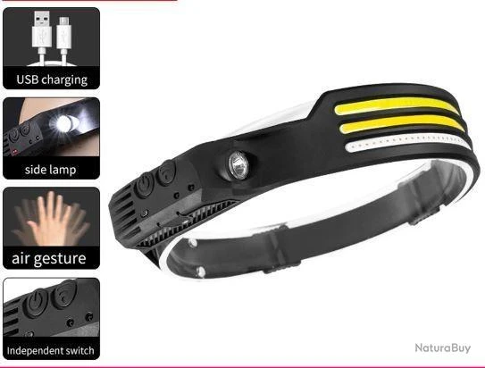 Lampe frontale à capteur COB LED Lampe de poche en silicone USB rechargeable Lampe frontale Torche Outdoor Camping, pêche, randonnée, plein air, travail etc.