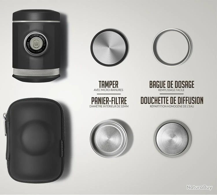 - Picopresso, panier filtre double, tamper, dosette, brosse, répartiteur de mouture, bague de dosage, étui de protection, manuel d’instructions multilingue, carte de garantie et un autocollant.
